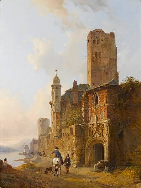 Figures conversing by a riverside town