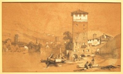 Paysage animé au bord d'une rivière