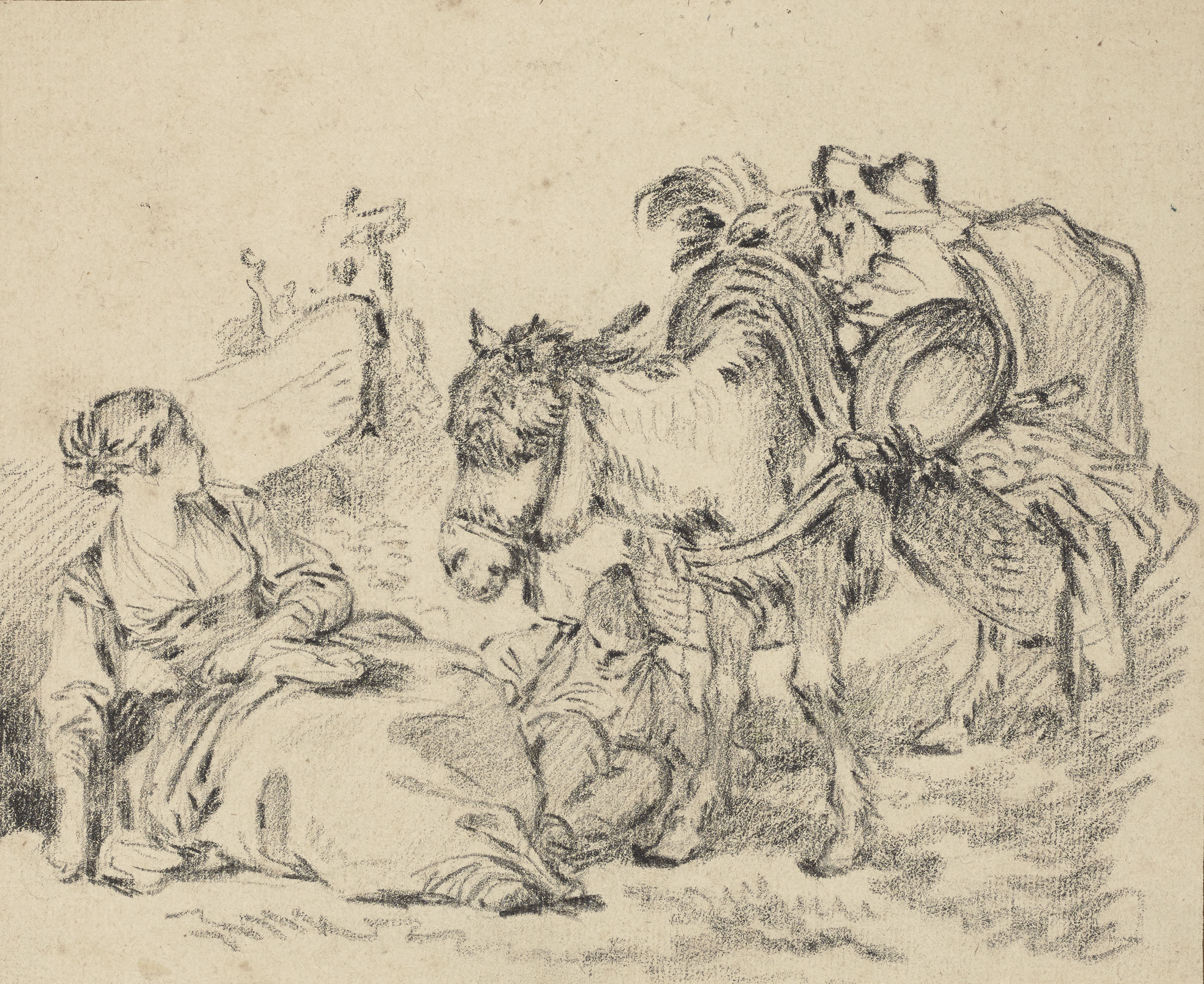 | Paysanne assise avec un enfant, un âne chargé de paniers à leurs côtés | |