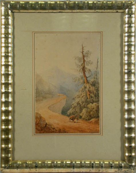 Passstraße im Hochgebirge, im Vordergrund einsamer Maultiertreiber vor einer windzerzausten Tanne