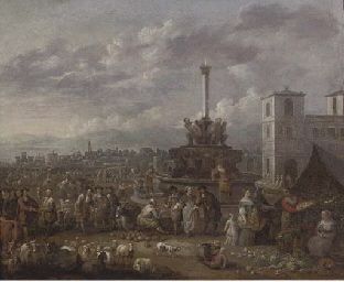 | Vegetable vendors by a fountain and other figures and cattle on a market square in an Italianate town | |