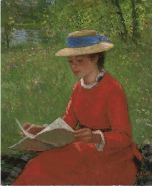 Elizabeth-Anne au chapeau de paille, lisant, assise au bord de l'eau