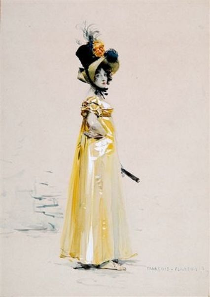Full-length study of a young lady wearing a feathered bonnet and long yellow dress