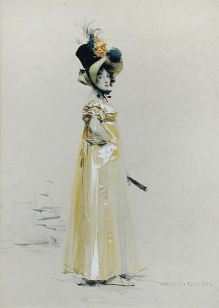 | Portrait of a Lady in yellow, with a cockaded hat with flowers and pom-pom trim | |