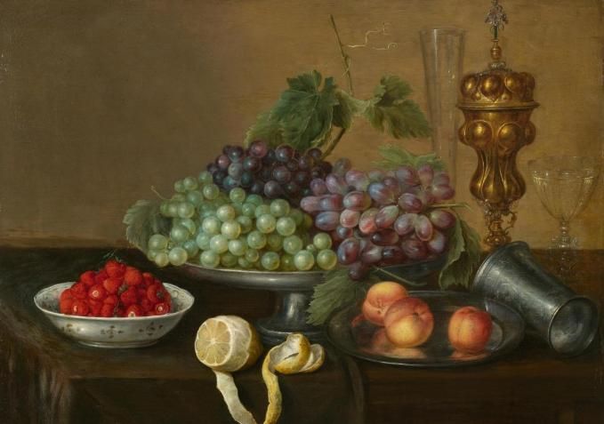 Still life of fruits with grapes, strawberries, peaches and lemon on a table.