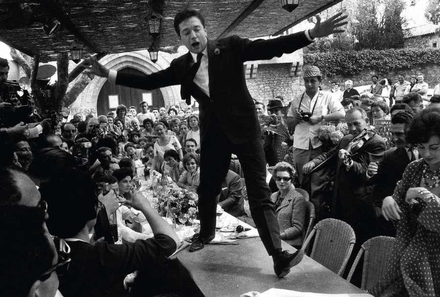 | Lors du 13e Festival de Cannes, Jean-Pierre Cassel improvise un pas de danse sur la table de la Mère Terrats, à La Napoule. Mai | |