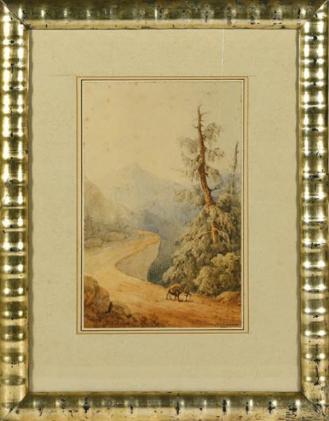 | Nebelverhangene Berglandschaft. Im Vordergrund ein einsamer Maultierführer neben einer mächtigen Wettertanne | |