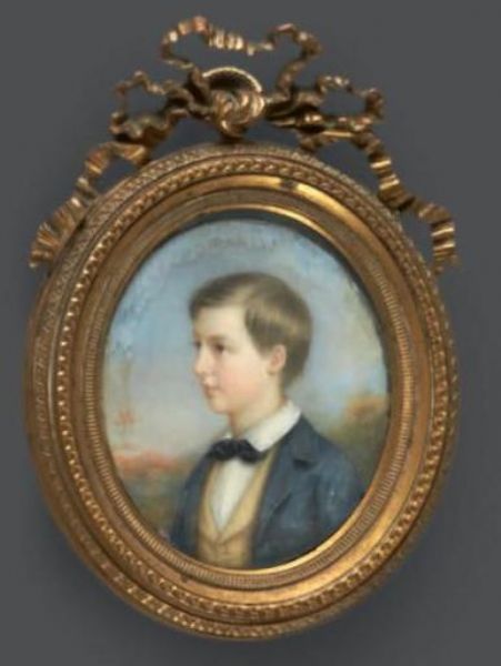 Portrait d'un jeune garçon blond, en veste bleue et gilet jaune sur fond de paysage