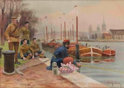 | Soldat français pêchant dans le port de Rouen sous les yeux de soldats britanniques | |