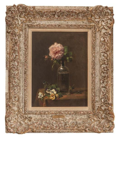 | Rose dans une bouteille sur un entablement garni de fleurs des champs. | |