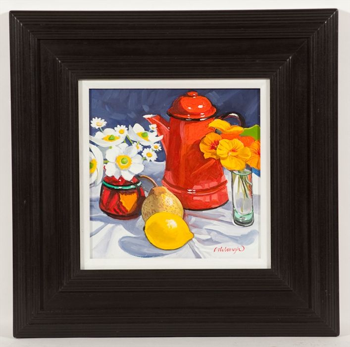 RED COFFEE POT, FRUIT AND FLOWERS