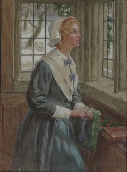 | A young girl standing in an interior, looking out at a winter landscape | |