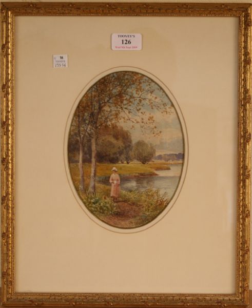 Oval Landscape with Woman walking on the Bank of a River