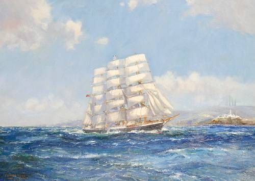 | A four masted sailing ship under full sail off a headland, possibly the 'Pamir' | |