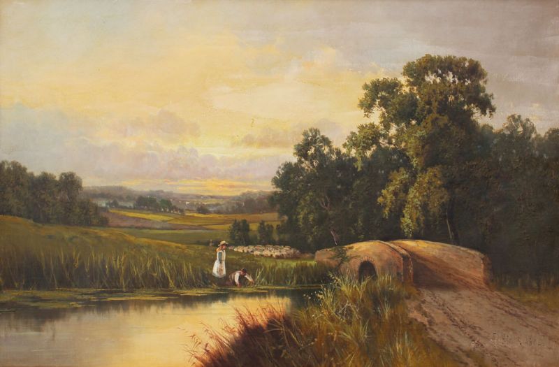 Panoramic Landscape with Figures by a Covered Bridge with Small Stream