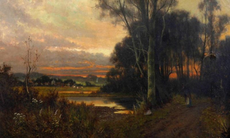 | Tranquil rural landscape with maid by a pool, together with another, with figure carrying firewood on a wooded path at dusk | |