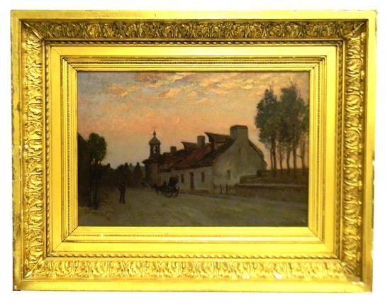 | landscape with cottages, farmer returning from fields, and slow-driving carriage, whole scene suffused with pink-lavender twilig | |