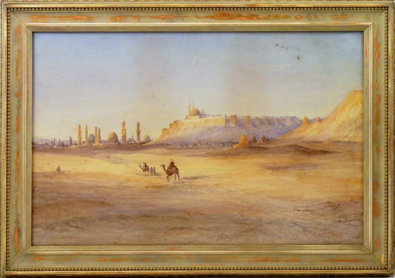 A MIDDLE EASTERN VIEW WITH FIGURES AND CAMELS
