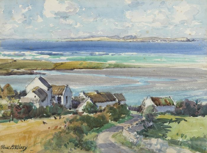COASTAL SCENE WITH COTTAGES AND CHICKENS