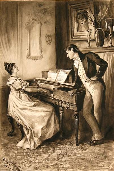 A woman playing the piano with an admirer nearby