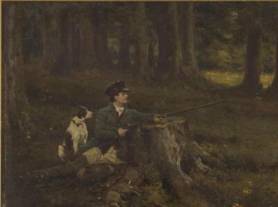 | Huntsman and His Dog Lying in Wait in Woodland | |