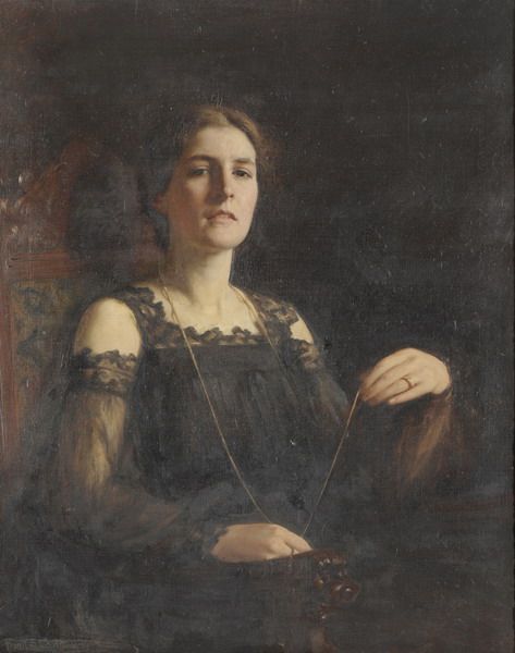 | Constance, portrait of a lady, seated, wearing a black chiffon dress, holding a necklace, the daughter of E.S. Goodes Esq. | |
