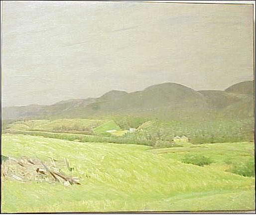 | Impressionistic depiction a valley of grasses in the foreground with a small pile of rocks and wood at left | |