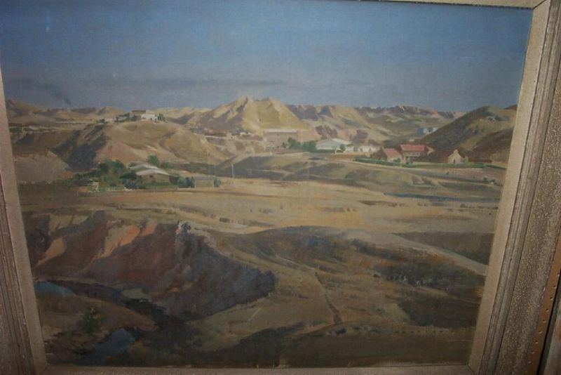 | an extensive arid landscape with mountains to the distance and a quarry to the foreground | |