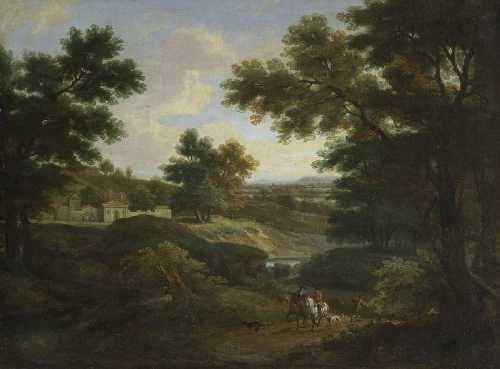 Baumlandschaft mit Reitern.