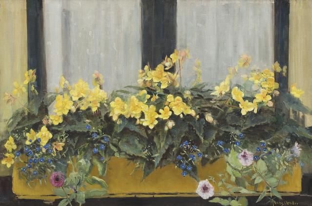 | Flowers in a window box: yellow begonias, forget-me-nots and petunias | |