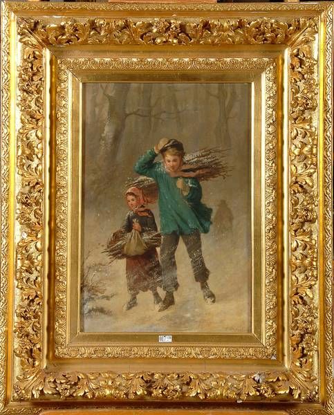 Jeunes enfants portant du bois dans la forêt enneigée