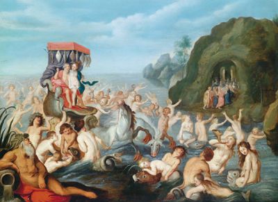 | Neptune and his wife Amphitrite accompanied by Tritons and Nereids in a horse-drawn carriage in the form of a shell on their way | |