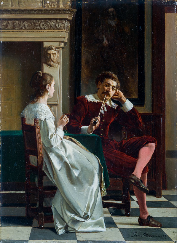 | Häuslicher Frieden. Junge Dame in weißem Seidenkleid beim Sticken in Gesellschaft eines rauchenden Kavaliers in rotem Samtanzug | |