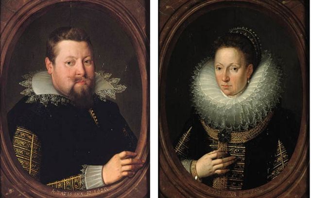 | Portrait of a gentleman, aged 32, bust-length, in a black doublet with gold brocade and a lace collar, in a feigned oval | |