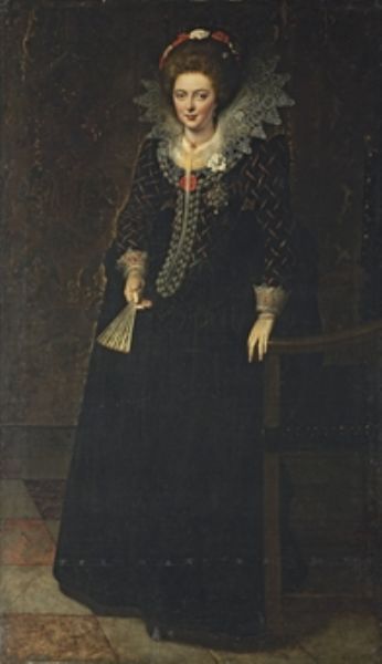 | Portrait of a lady, full-length, in a black dress with a jewelled brooch, holding a fan | |