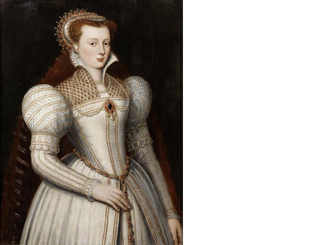 Portrait of lady, half-length, in white bejewelled dress and headress