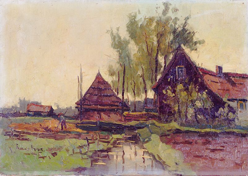 Häuser am Kanal und Bauer beim Heumachen.
