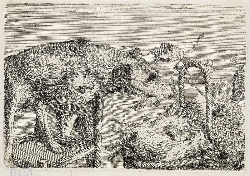 Two Dogs, a Head of a Pig in a Basket with Fruit.