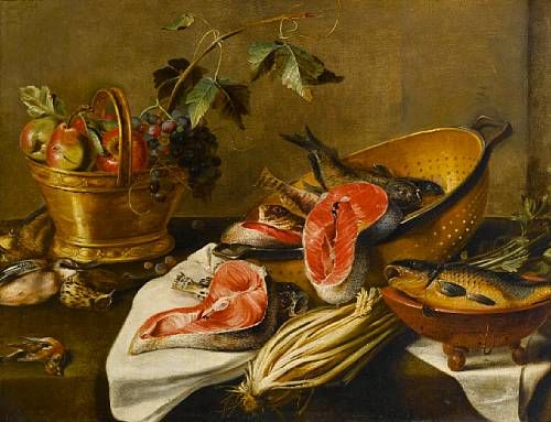 | A colander filled with salmon with a copper basket of apples and grapes with dead songbirds and celery on a draped table-top | |