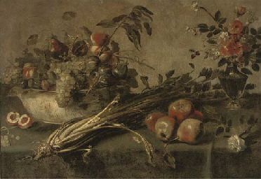| Grapes, figs, plums and peaches in a porcelain bowl, with roses and other flowers in a glass vase, with pears, celery and a halv | |