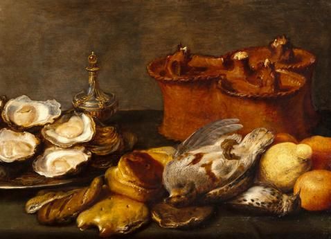 Nature morte au plat d'huîtres, tourte, fruits et perdrix