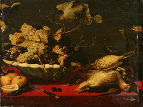 Coupe de raisins, citrons, perdrix, grive et autres oiseaux chanteurs sur une table drapée