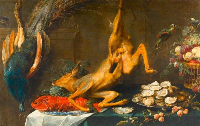 Stilleben mit Wild, Hummer, Austern und Früchten.