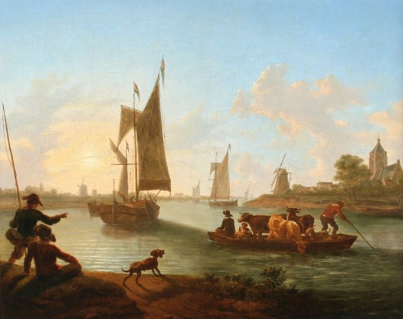 | Riverlandscape with sailing boats and a ferry with figures and cattle. In the front two fishermen, a village and some windmills | |