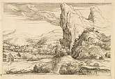 Gebirgslandschaft mit spitzem Felsen und Landhäusern
