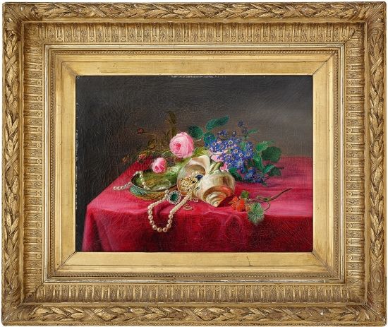 Oppstilling med blomster, muslinger og smykker