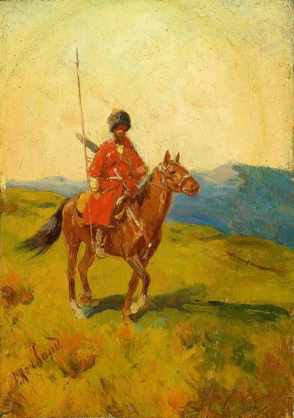 | Tscherkessenreiter im roten Mantel mit Fellmütze und Lanze | |