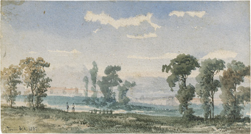 Baumbestandene Landschaft mit einem Paar vor einer Stadtkulisse.