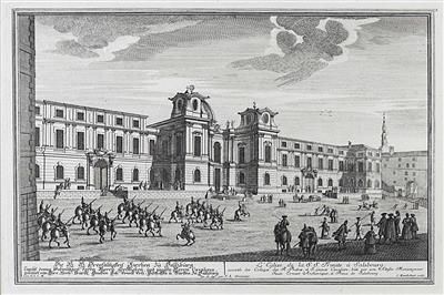 | Ansicht der Dreifaltigkeitskirche in Salzburg mit Parade des fürsterzbischöflichen Militärs | |