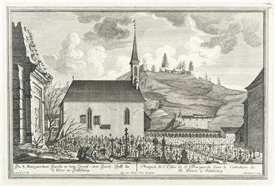 | Ansicht der Margareten-Kirche auf dem Friedhof von St. Peter in Salzburg und die Mönchsberg-Befestigungen | |